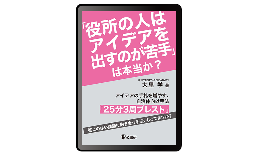 著者は、広告会社勤務の立場から実際に市役所に入り込み、行政の現場で「アイデア」が生まれにくい構造や文化を観察。そこで気づいたのが「“立ち話”“会議”はあるが、答えのない課題に向き合う“打ち合わせ”がない!」こと。その処方箋として開発されたのが、自治体職員の創造性を引き出す具体的メソッド「25分3周ブレスト」です。