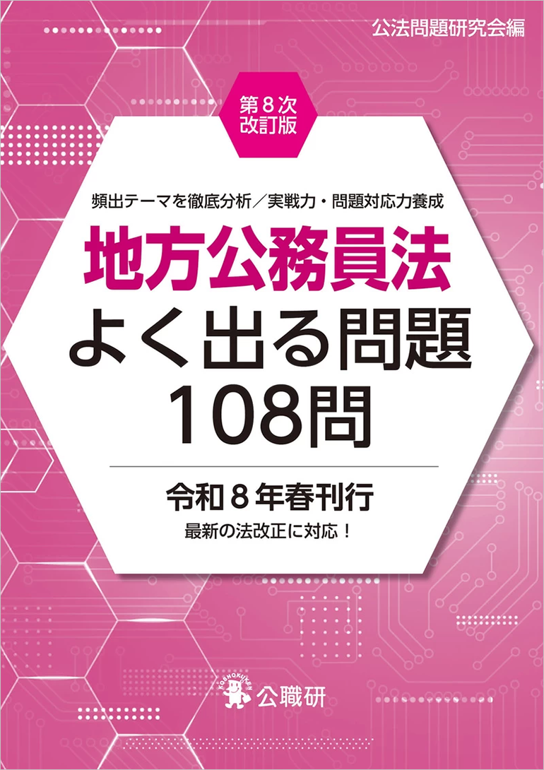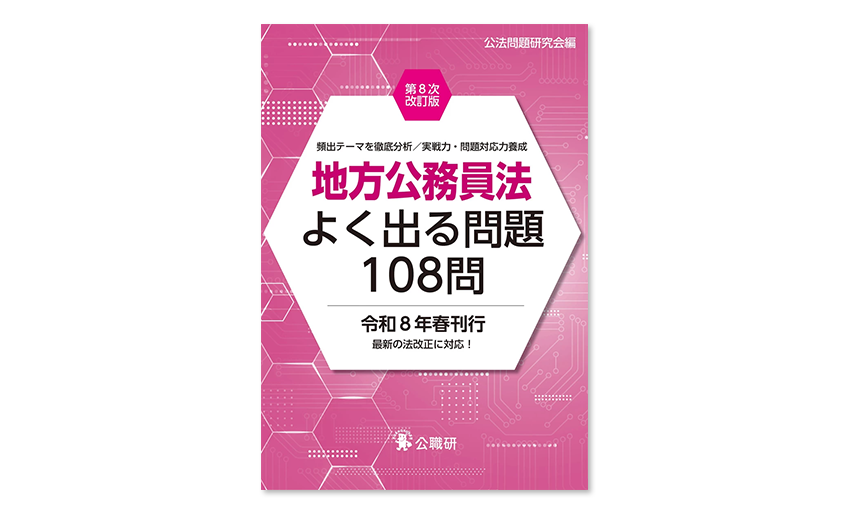 【書名】地方公務員法よく出る問題108問 第8次改訂版 【執筆者名】公法問題研究会 編 【定価】2310 円(本体価格2100円+税率10%) 【ISBN】978-4-87526-469-9 【出版年月】2026年3月 【判型・ページ数】B6判 224頁