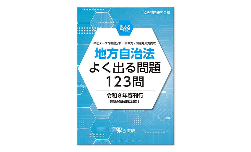 【書名】地方自治法よく出る問題123問 第8次改訂版 【執筆者名】公法問題研究会 編 【定価】2420 円(本体価格2200円+税率10%) 【ISBN】978-4-87526-468-2 【出版年月】2026年3月 【判型・ページ数】B6 判 254頁