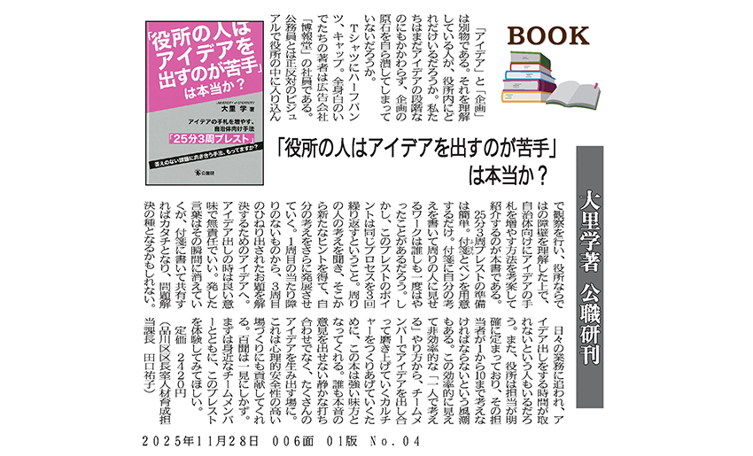 『都市問題』2025年12月号で、大里学さん著『「役所の人はアイデアを出すのが苦手」は本当か?』の紹介記事を掲載していただきました。